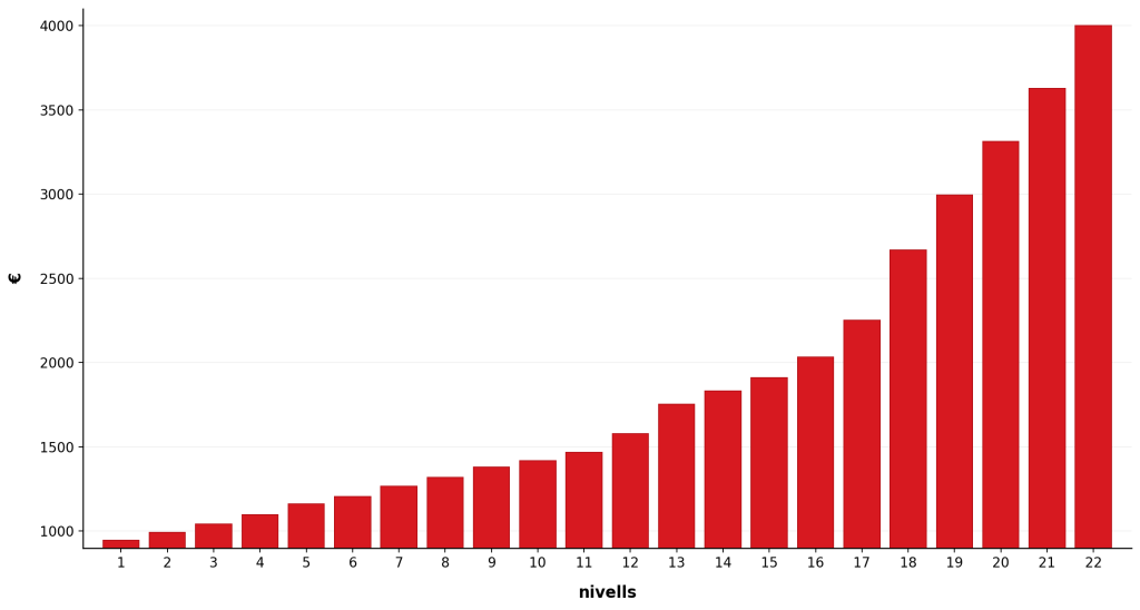 És a dir, tot i que el percentatge és similar, l’impacte real en euros és molt diferent. I aquesta diferència no és menor: mentre que els nivells més baixos veuen increments moderats, els nivells més alts acumulen increments molt més significatius en termes absoluts.
