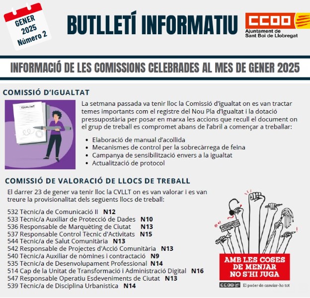 Aprofitem també per recordar-vos que CCOO està lluitant per garantir unes condicions laborals dignes i perquè les mesures que es prenen dins l’Ajuntament siguin justes i transparents per a tothom. Seguirem informant-vos i defensant els vostres drets!