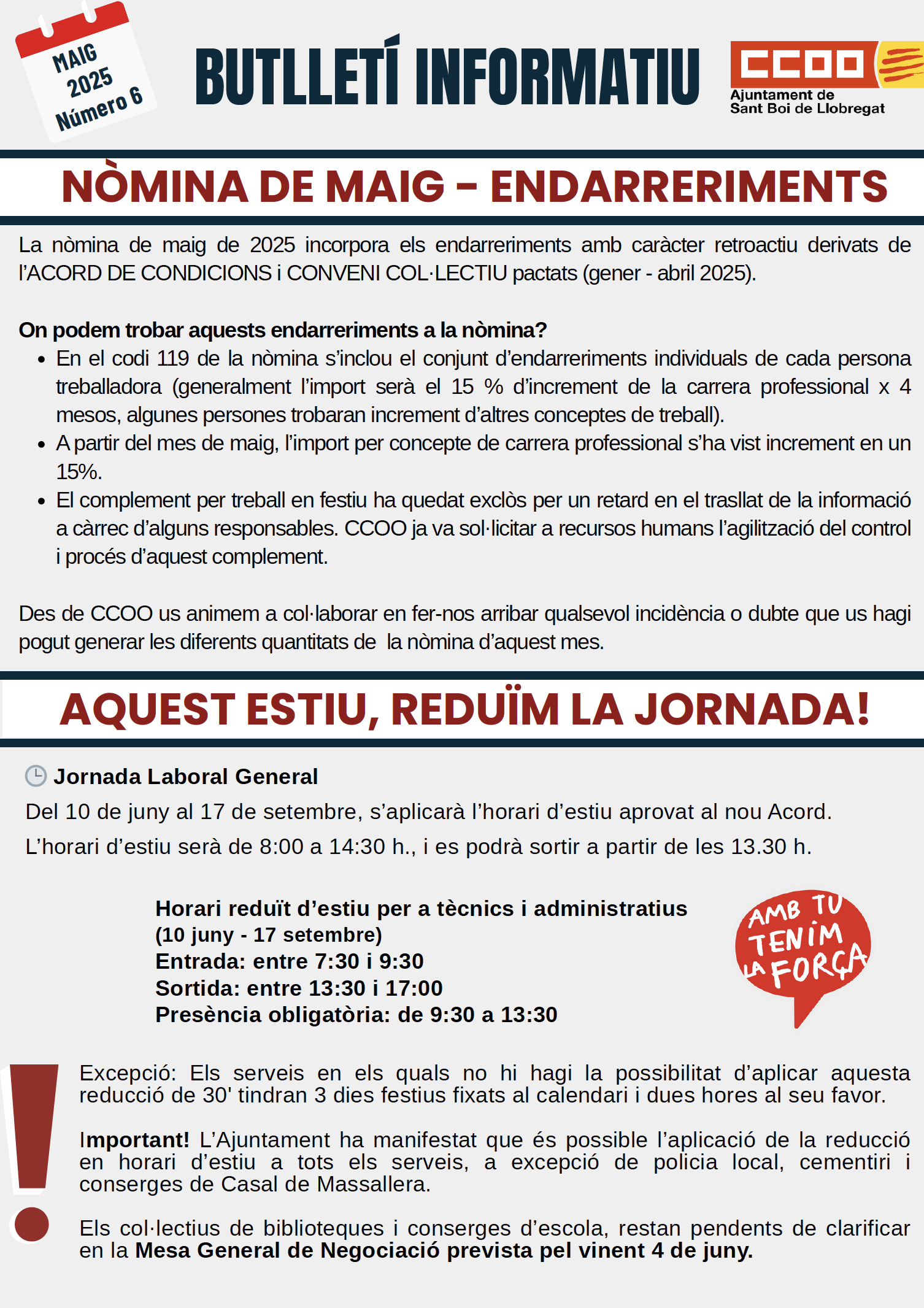 Aquest mes de maig arriba carregat de novetats importants! A CCOO volem informar-te sobre la incorporació dels endarreriments a la nòmina i l’inici de l’horari d’estiu.