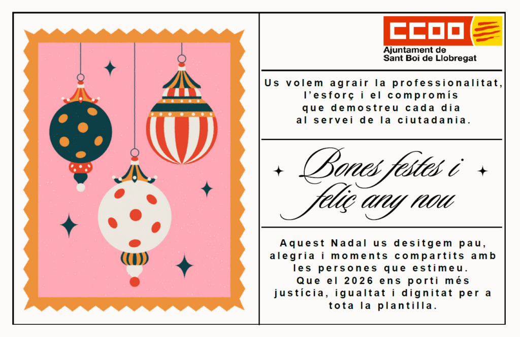 Arriben les festes de Nadal i, com a companys i companyes de feina, des de la Secció Sindical de CCOO de l’Ajuntament de Sant Boi volem fer-vos arribar una felicitació sincera i propera. Uns dies per descansar, compartir temps amb les persones que estimem i recarregar energies després d’un any intens de feina i esforç col·lectiu.