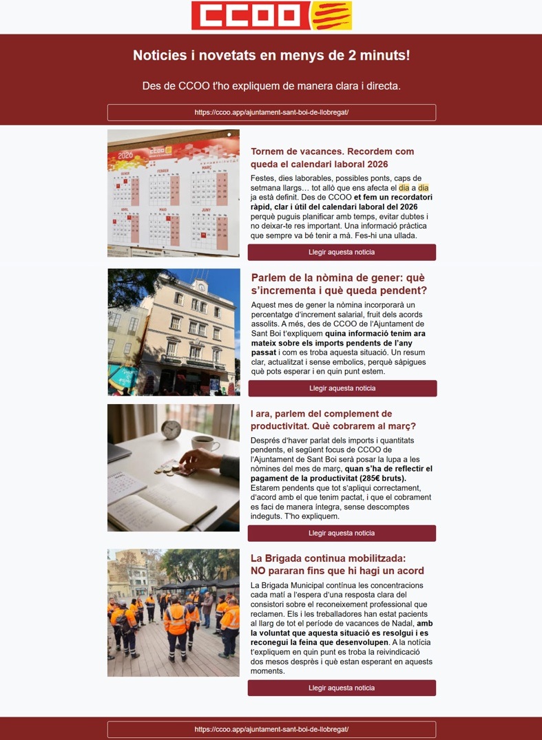 Aquest mes de gener la nòmina incorporarà un percentatge d’increment salarial, fruit dels acords assolits. A més, des de CCOO de l’Ajuntament de Sant Boi t’expliquem quina informació tenim ara mateix sobre els imports pendents de l’any passat i com es troba aquesta situació. Un resum clar, actualitzat i sense embolics, perquè sàpigues què pots esperar i en quin punt estem.