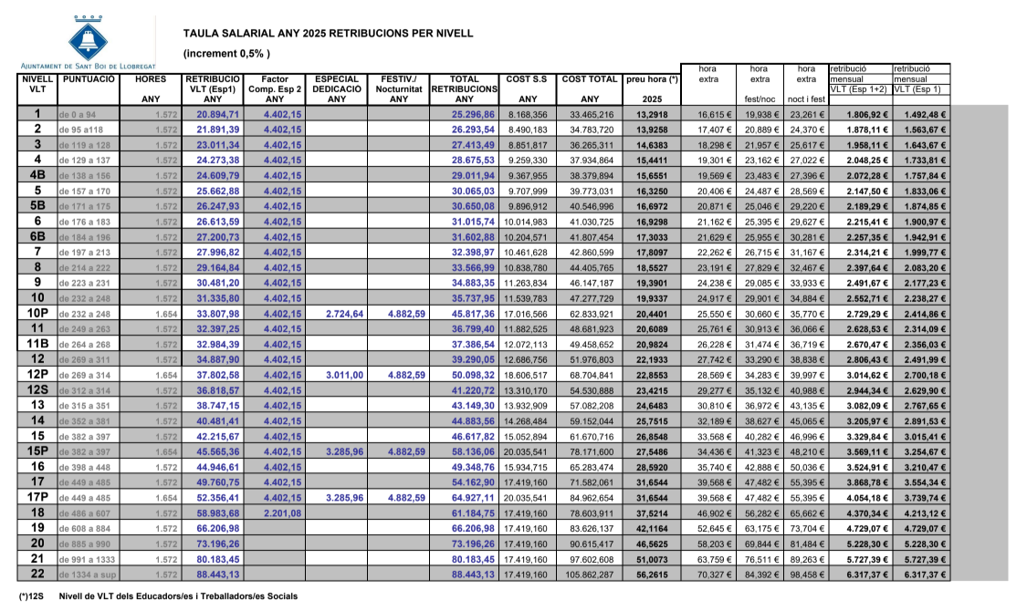 En el document que adjuntem trobaràs el detall de les retribucions vigents per a l’any 2025, amb l’actualització del 0,5% i el còmput anual de 1572 hores. Tot queda recollit de manera esquemàtica perquè puguis identificar fàcilment: