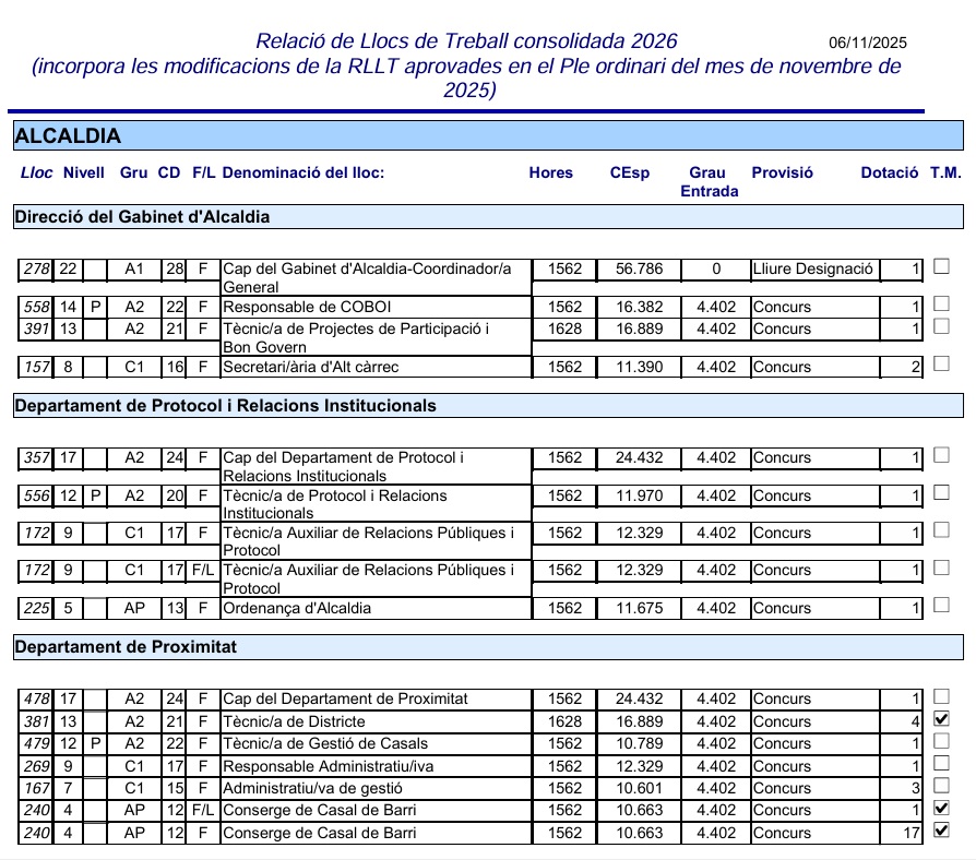 Aquesta pàgina que teniu al davant és una eina clau per entendre millor com està organitzat el nostre Ajuntament. La Relació de Llocs de Treball (RLLT) no és només un llistat burocràtic: és el document que defineix qui fa què, en quin departament, amb quin nivell professional i quin reconeixement econòmic hi ha assignat.