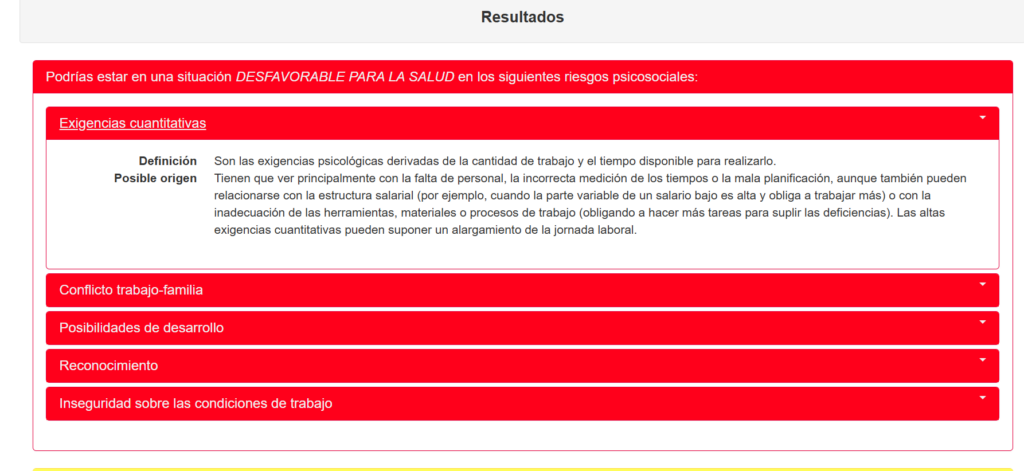 El qüestionari consta de 30 preguntes molt directes i fàcils de respondre. En acabar l’última, el sistema et mostra uns resultats en forma de quadres de colors (verd, groc o vermell), segons el nivell de risc detectat en diferents àmbits. No és cap diagnòstic ni una avaluació oficial, sinó una eina visual que t’ajuda a fer una reflexió personal sobre la teva situació laboral actual.