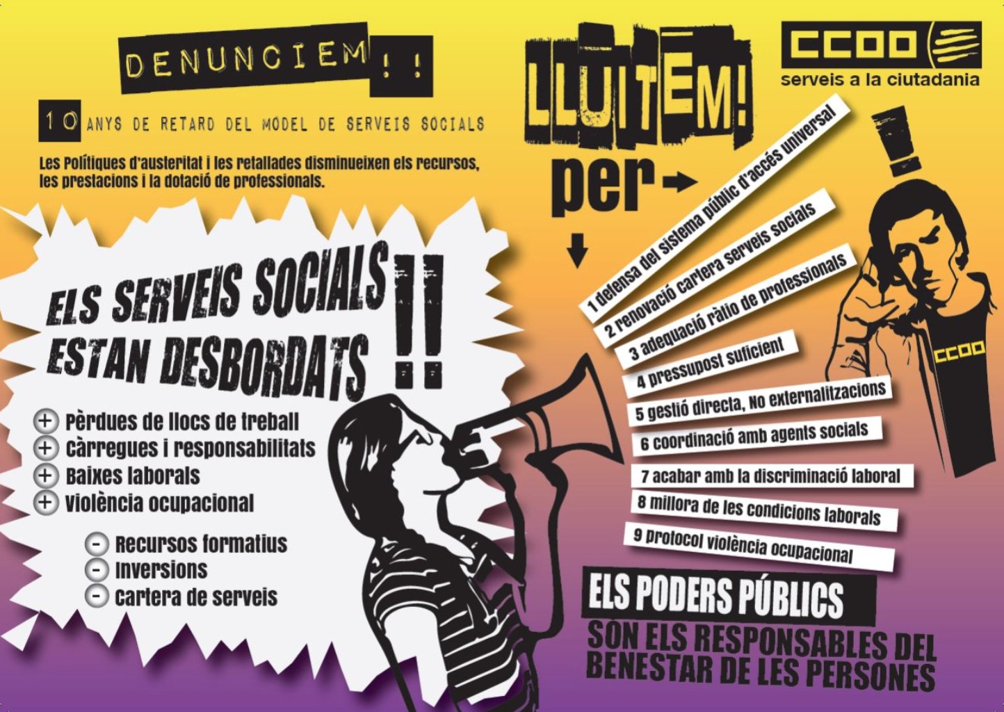 Des de CCOO fa temps que denunciem que els Serveis Socials estan desbordats. Violència ocupacional, càrregues de treball, baixes laborals, recursos i cartera de serveis són entre altres molts, temes a què cal donar resposta.En l’àmbit estatal participarem en un estudi en col·laboració amb el Colegio de Psicologia, per tal de poder demostrar amb dades la situació dels diferents serveis socials.