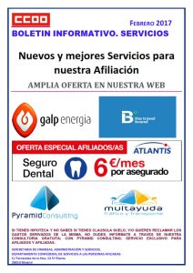 A través del siguiente enlace puedes acceder al nuevo Boletin Informativo de Servicios (Febrero 2017), en el que hemos resumido una parte de las múltiples ofertas de Servicios que tu como persona afiliada puedes disfrutar y obtener unas condiciones muy ventajosas tanto para ti como para tu familia.