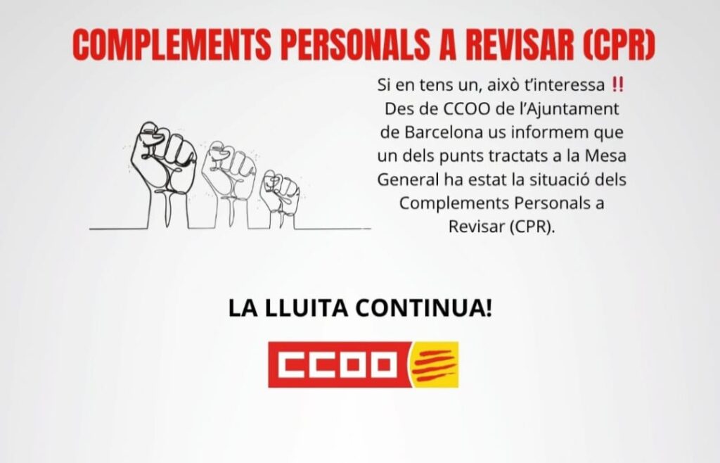 Des de la Secció Sindical de CCOO de l’Ajuntament de Barcelona us informem que ahir es va reunir la Mesa General en la negociació del nou conveni i un dels punts de l’ordre del dia han estat els CPR (Complements Personals a Revisar).