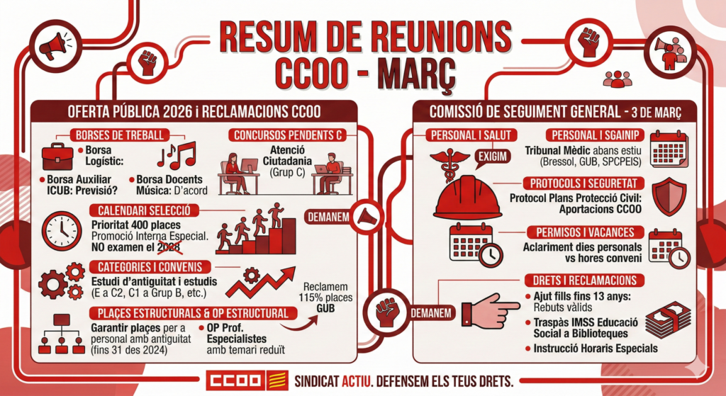Ahir vam tenir reunió de Mesa General per aprovar l’Oferta Pública de 2026. Des de CCOO hem aprofitat per fer una sèrie de reclamacions: