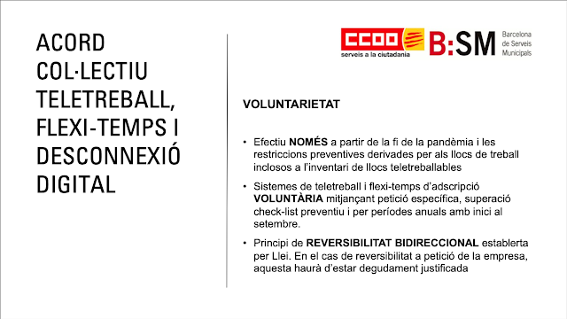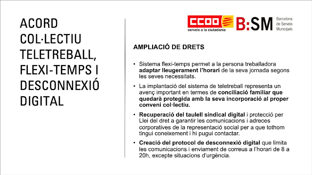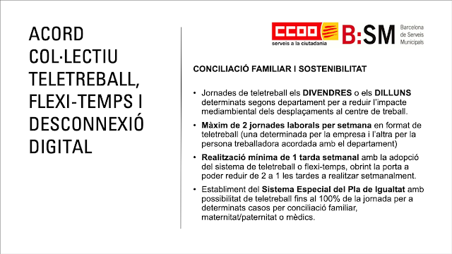El passat mes d’agost vam formalitzar un acord col·lectiu sobre treball a distància, flexi-temps i desconnexió digital que permetés poder assentar les basses per a que la organització del treball tingués en compte el teletreball més enllà de la pandèmia que estem patint. Amb aquest acord aconseguim que el teletreball es normalitzi en el desenvolupament de les activitats de la empresa, un fet que era impensable abans de la pandèmia i que millora la conciliació familiar per a diversos col·lectius.