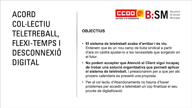 Per tot això, tot i haver signat l’acord de teletreball, no podem estar del tot satisfets amb aquest perquè tot i representar un avenç important per bona part del personal de BSM, no podem acceptar que es discrimini un col·lectiu sense cap raó ni argument vàlid, i fins que no sigui inclòs el departament d’Atenció al Client a l’inventari de llocs teletreballables no ens podrem donar plenament per satisfets.