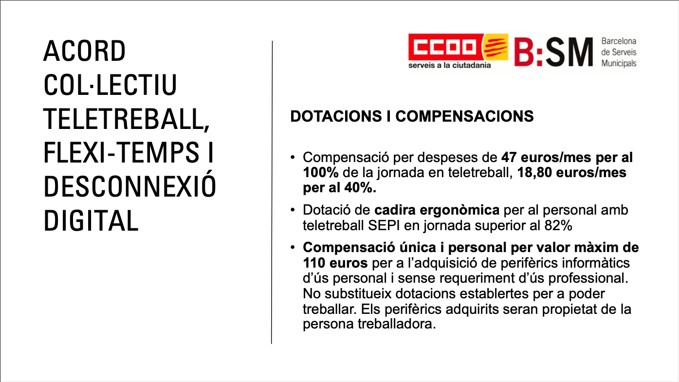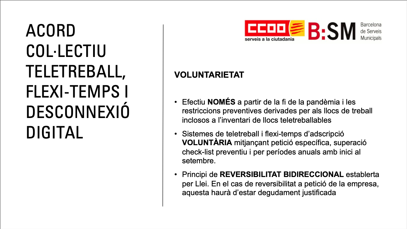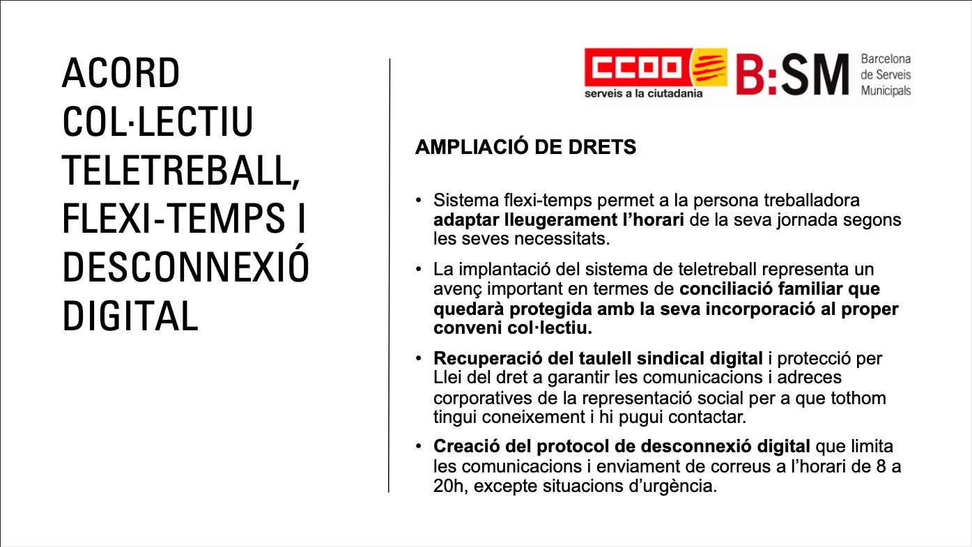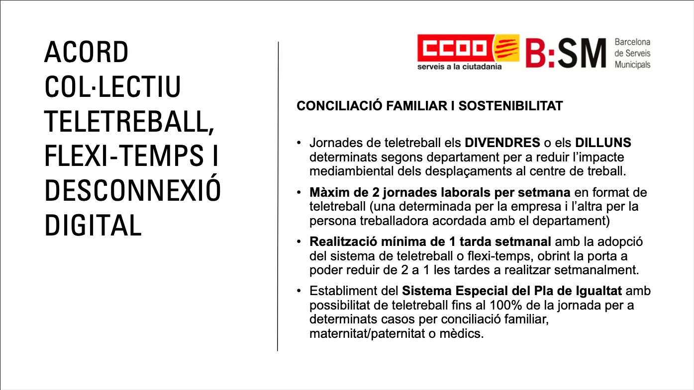 El passat mes d’agost vam formalitzar un acord col·lectiu sobre treball a distància, flexi-temps i desconnexió digital que permetés poder assentar les basses per a que la organització del treball tingués en compte el teletreball més enllà de la pandèmia que estem patint. Amb aquest acord aconseguim que el teletreball es normalitzi en el desenvolupament de les activitats de la empresa, un fet que era impensable abans de la pandèmia i que millora la conciliació familiar per a diversos col·lectius.
