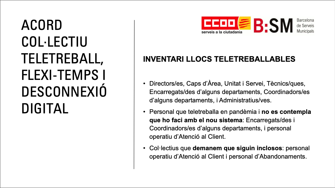 Per tot això, tot i haver signat l’acord de teletreball, no podem estar del tot satisfets amb aquest perquè tot i representar un avenç important per bona part del personal de BSM, no podem acceptar que es discrimini un col·lectiu sense cap raó ni argument vàlid, i fins que no sigui inclòs el departament d’Atenció al Client a l’inventari de llocs teletreballables no ens podrem donar plenament per satisfets.