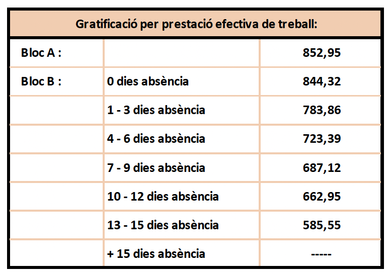 A continuació trobareu la taula de quantitats de la paga d’absentisme 2024 per a que pogueu consultar quina quantitat heu deixat de percebre.