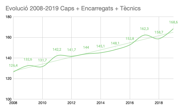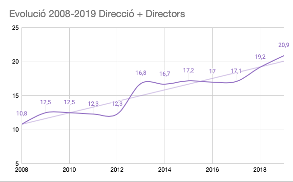 Lo primero que observamos es que el crecimiento de puestos de Dirección de la empresa y de las respectivas divisiones y unidades, refleja un crecimiento constante. Esto demuestra que la empresa ha ido ampliando su carta de servicios durante este periodo, asumiendo nuevos negocios como son el Bicing, Park Güell, ZonaBus, Agents Cívics, SMOU, etc.
