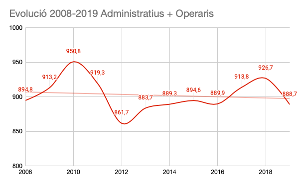 Es aquí donde nos topamos con la primera sorpresa, la evolución del empleo en los puestos de operadores/as y administrativos/as, refleja un claro descenso, sobretodo en el acumulado total y en lo que respecta a este último año 2019. ¿Cómo puede ser que en una empresa que ha asumido varios servicios, encargos y proyectos, muestre un descenso de personal operativo durante el mismo periodo?