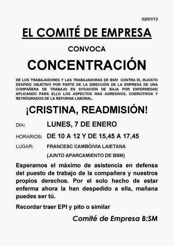 El comité de empresa de BSM, convocamos a todos/as los trabajadores/as el próximo lunes 7 de enero, en horario de 10h y 15:45h, en Francesc Cambó con Via Laietana, a realizar concentración para exigir la readmisión de nuestra compañera Cristina, despedida recientemente por estar de baja por enfermedad.