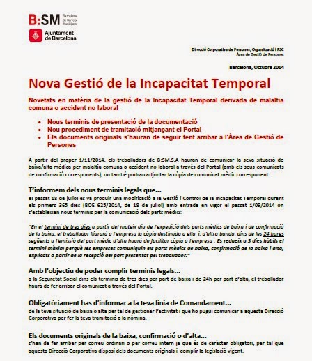 Ayer, jueves 30 de octubre, la Dirección de RRHH, colgaba en el portal del empleado un nuevo protocolo sobre la gestión de la incapacidad temporal, en cuanto a la tramitación de los correspondientes partes de baja, confirmación y alta.
