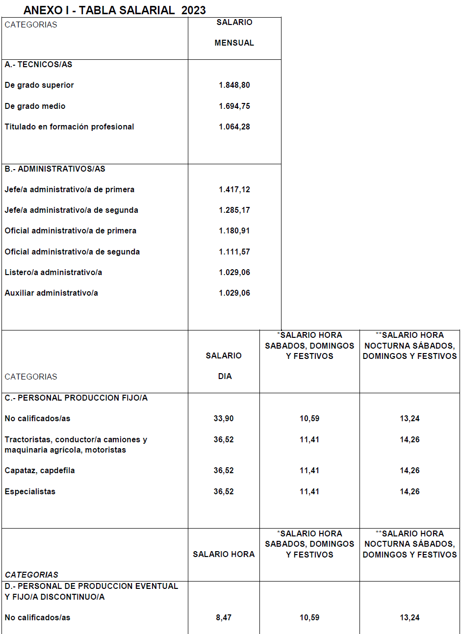 I. En fecha 07/03/2023 se presentó acta de acuerdo sobre la tabla salarial para el año 2023 suscrita, por un lado, por los representantes de la Federación de Empresarios de Frutos y Productos Hortícolas (FEXPHAL) y de la Asociación Provincial de Jóvenes Agricultores Asaja de Alicante y, por otro lado, por los representantes de la Centrales Sindicales Federación Industria CCOO PV y FICA UGT PV.