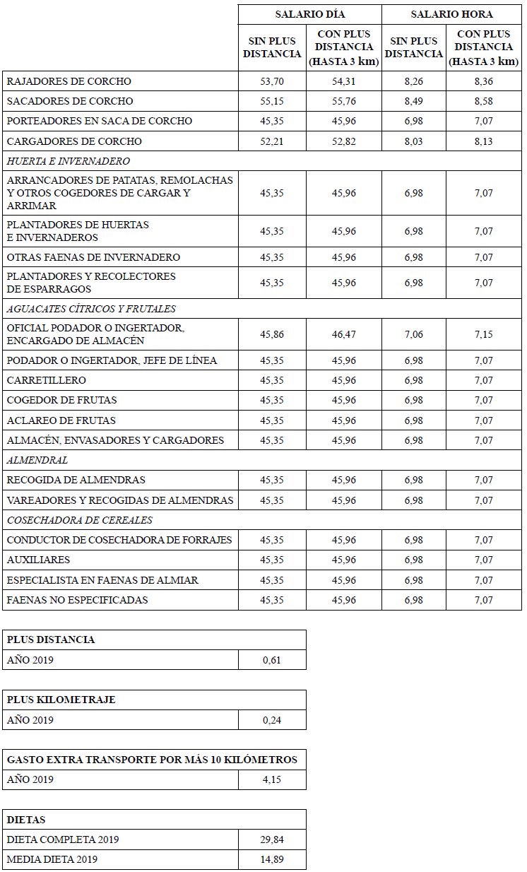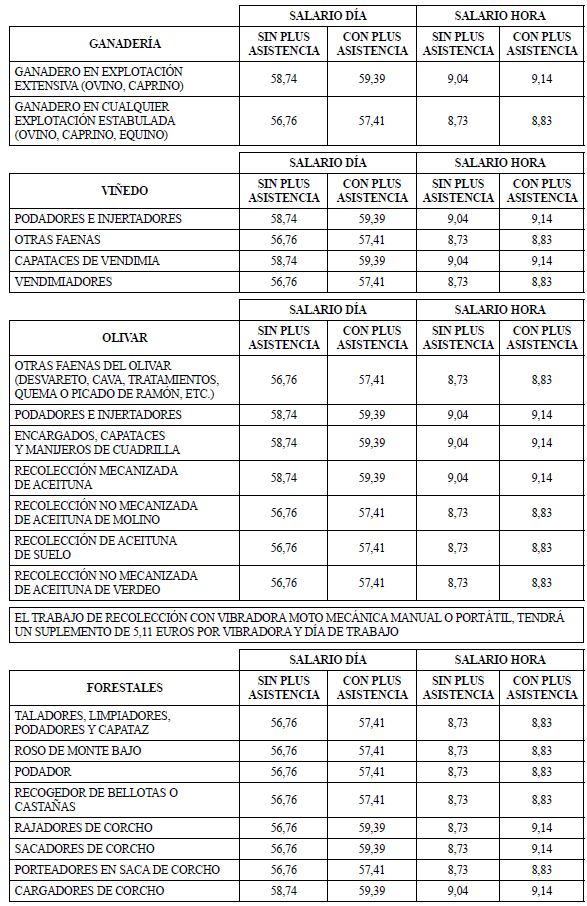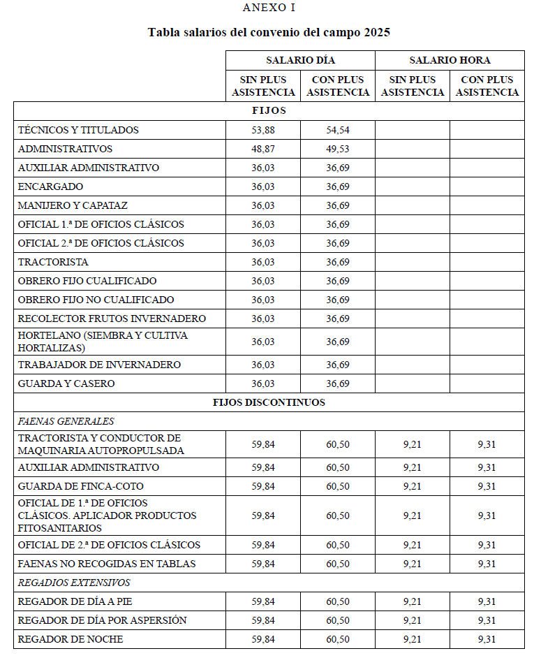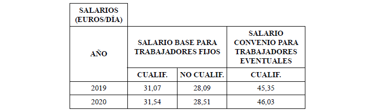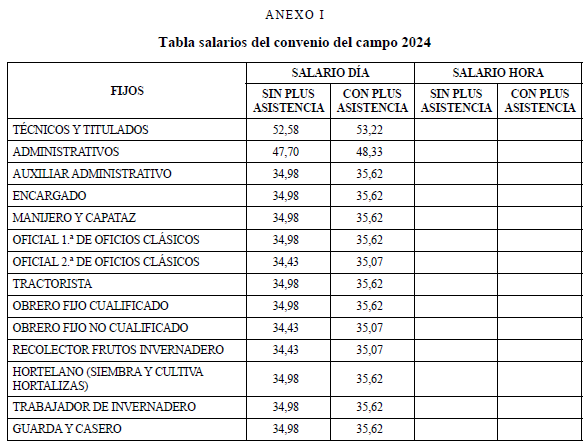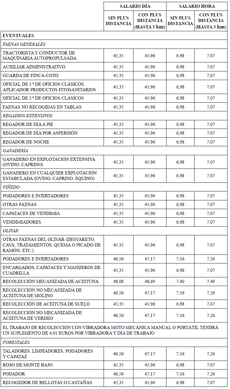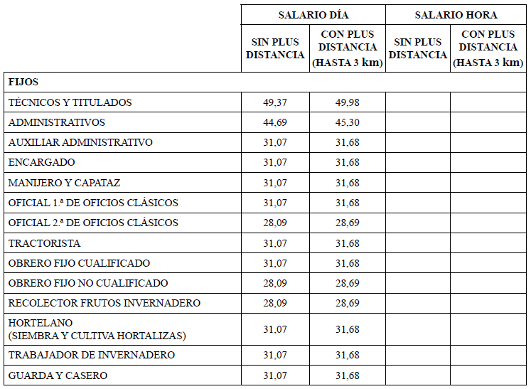 El salario por día trabajado de los trabajadores fijos discontinuos será el recogido en las tablas salariales que se anexan, incluyendo este todos los conceptos salariales (domingos, festivos, descansos, vacaciones, gratificaciones extraordinarias…) – Personal eventual: Tienen esta consideración las personas trabajadoras contratadas por un mismo empresario para una o varias operaciones agrarias o para períodos de tiempo determinados.
