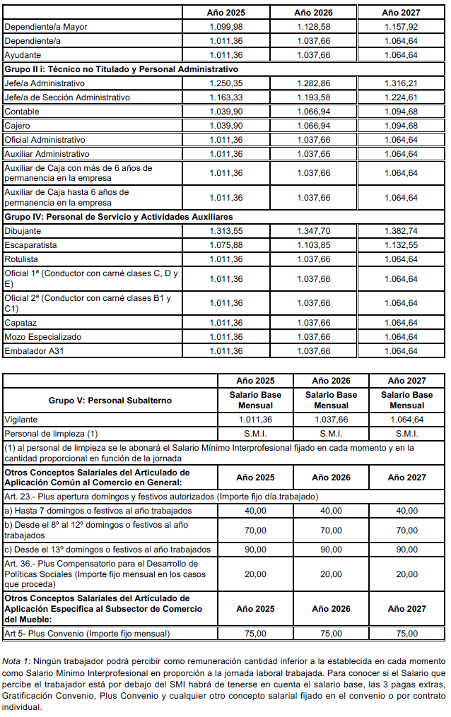 ANEXO IV.- Subsector de Comercio del Mueble. Tablas Salariales Años 2025, 2026 y 2027.