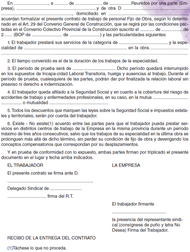 Se establece un modelo de contrato para trabajo fijo en obra, que se recoge como anexo a este Convenio.