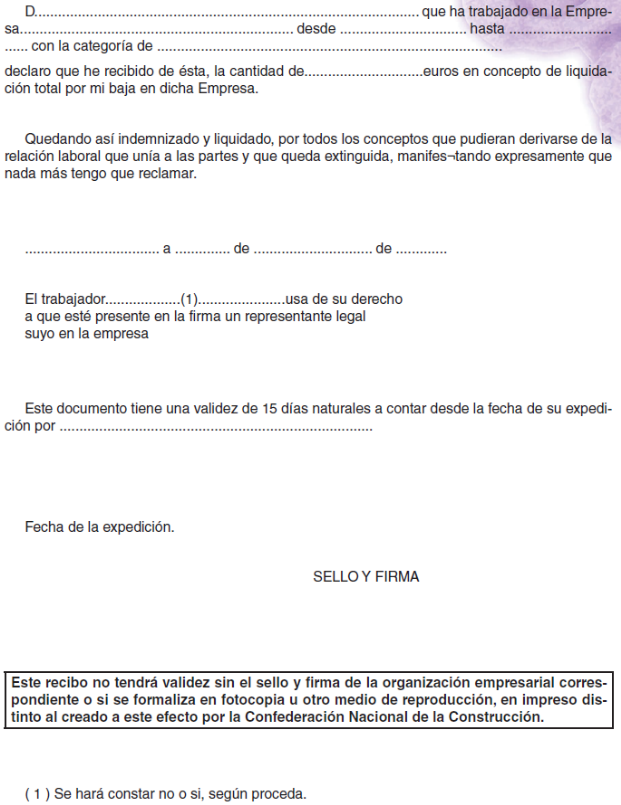Toda propuesta de cese o de preaviso de cese deberá ir acompañada del recibo de finiquito que deberá ser conforme al modelo que figura anexo de este convenio. La Confederación Nacional de la Construcción lo editará y será expedido por la Asociación de Empresarios Salmantinos de la Construcción [AESCON], teniendo una validez de 15 días naturales siguientes a la fecha de expedición.