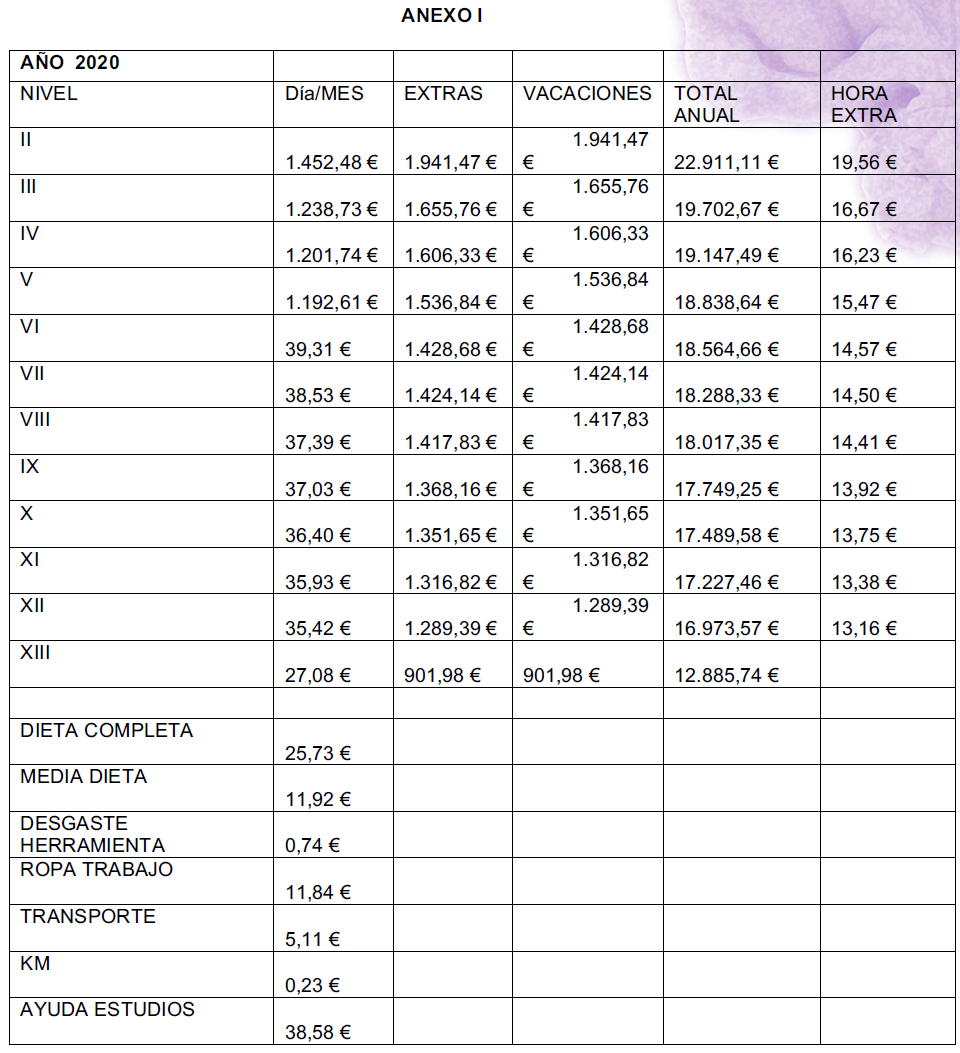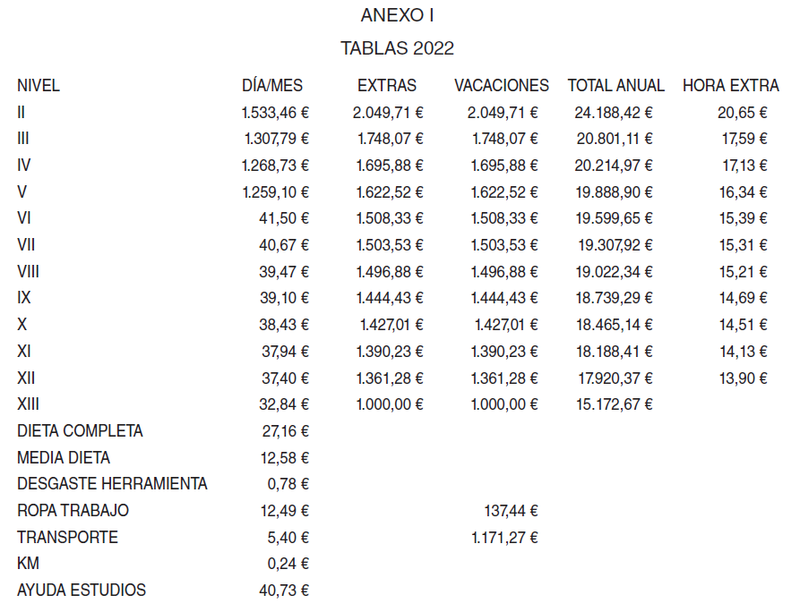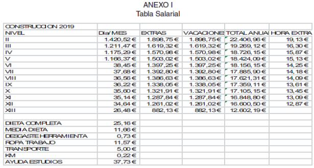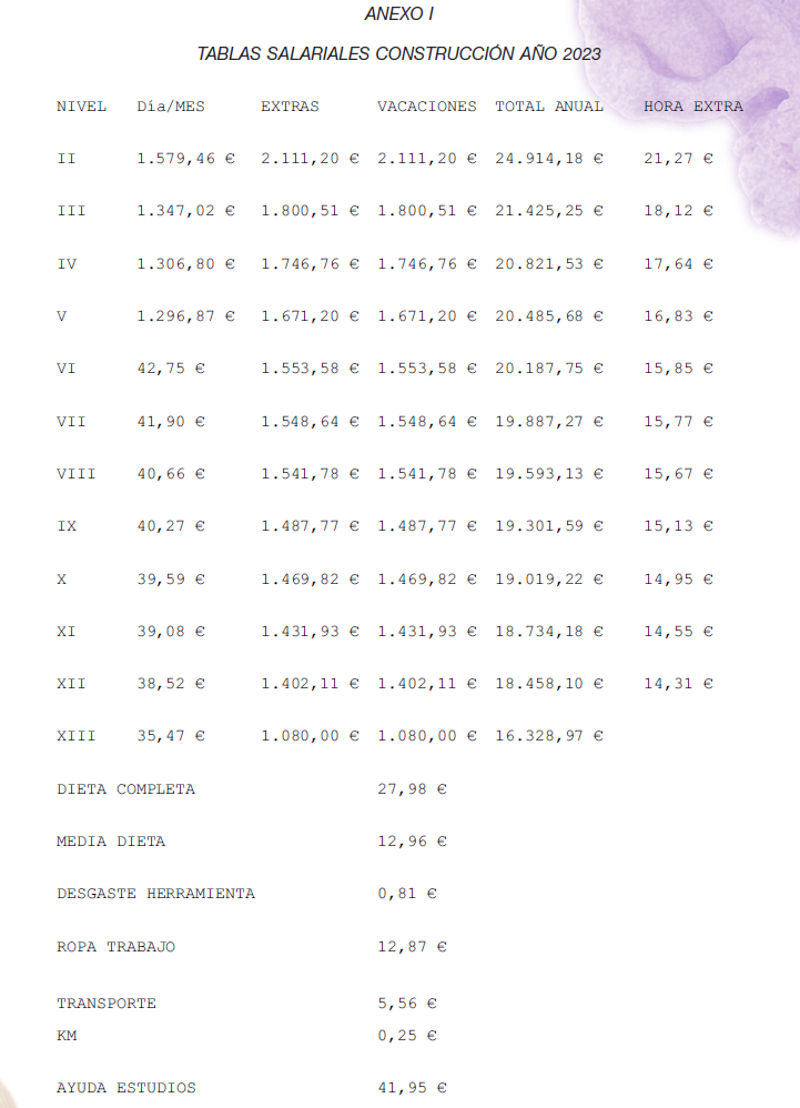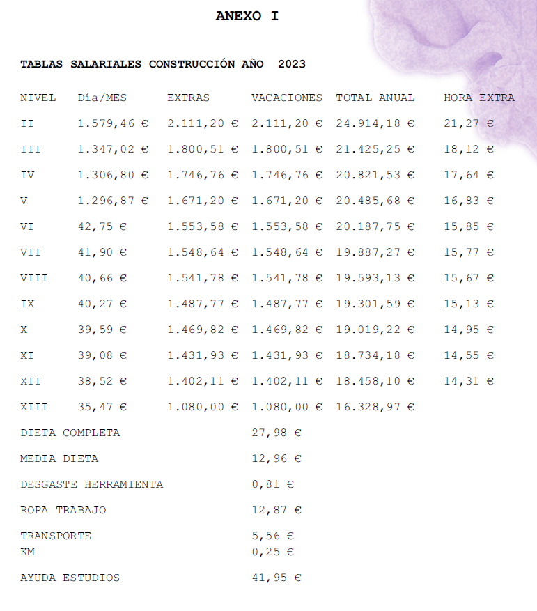 «Aplicar para el año 2023 el incremento pactado por Comisión Negociadora del Convenio General del Sector de la Construcción, reflejándose el resultado en las tablas salariales que se acompañan como anexo I a la presente acta»