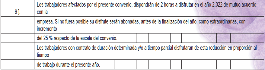Los trabajadores afectados por el presente convenio, dispondrán de 3 horas a disfrutar en el año 2024 de mutuo acuerdo con la empresa. Si no fuera posible su disfrute serán abonadas, antes de la finalización del año, como extraordinarias, con incremento del 25 % respecto de la escala del convenio.