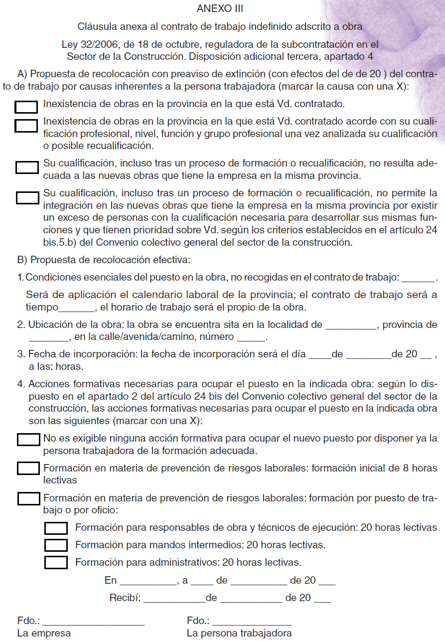 NOVENA.- El anexo III del actual Convenio colectivo, relativo al derogado contrato fijo de obra, se sustituye por la Cláusula anexa al contrato de trabajo indefinido adscrito a obra, que pasa a conformar el citado anexo.