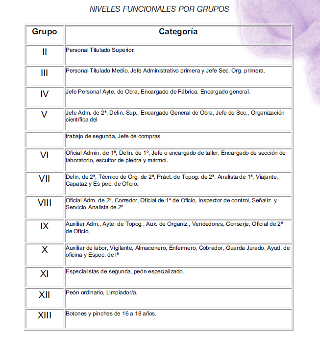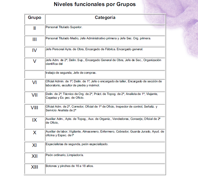 IX Auxiliar Adm., Ayte. de Topog., Aux. de Organiz., Vendedores, Conserje, Oficial de 2ª de Oficio.