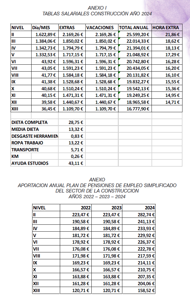 En referida acta se aprueba aplicar para el año 2024 el incremento pactado por Comisión Negociadora del Convenio General del Sector de la Construcción, reflejándose el resultado en las tablas salariales que se acompañan como anexo I de esta resolución, que van acompañadas de un cuadro descriptivo de los niveles funcionales por grupos de las diversas categorías de trabajadores.
