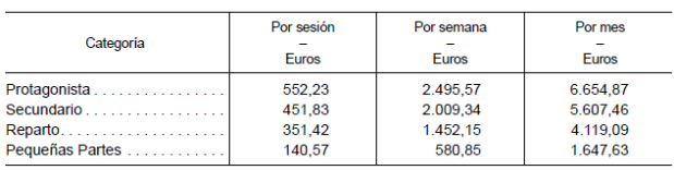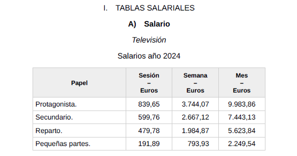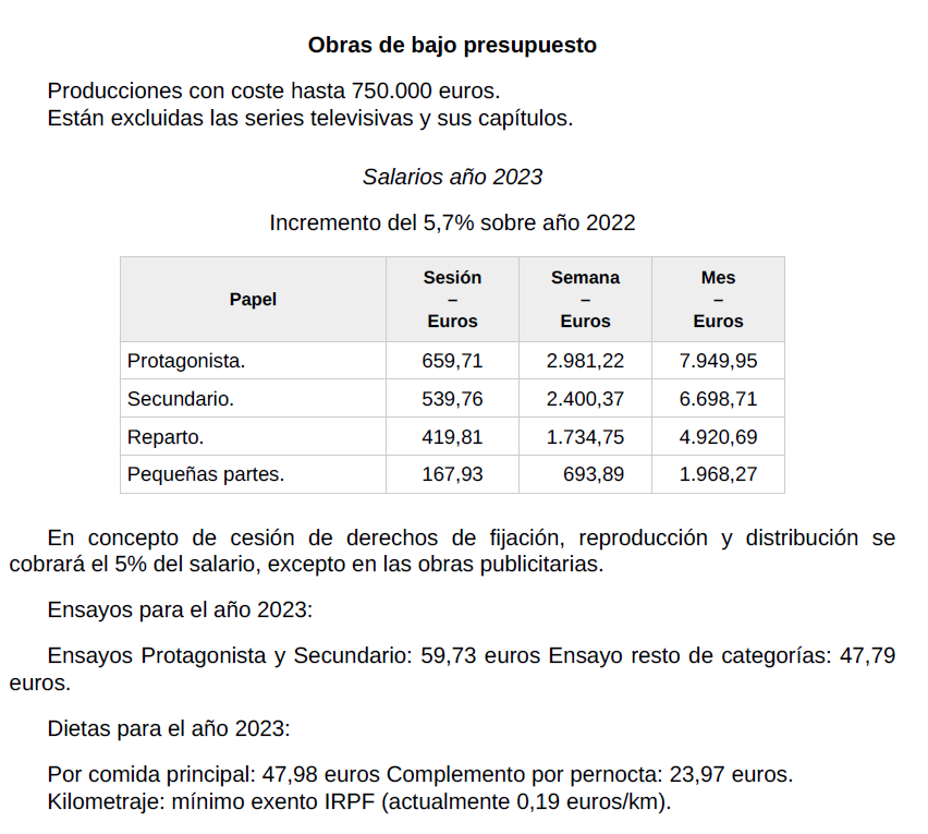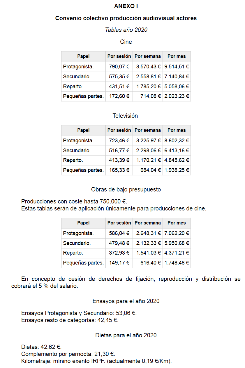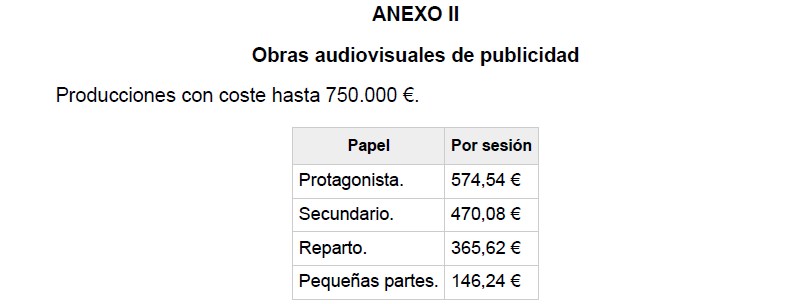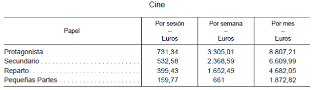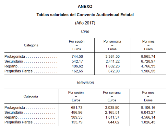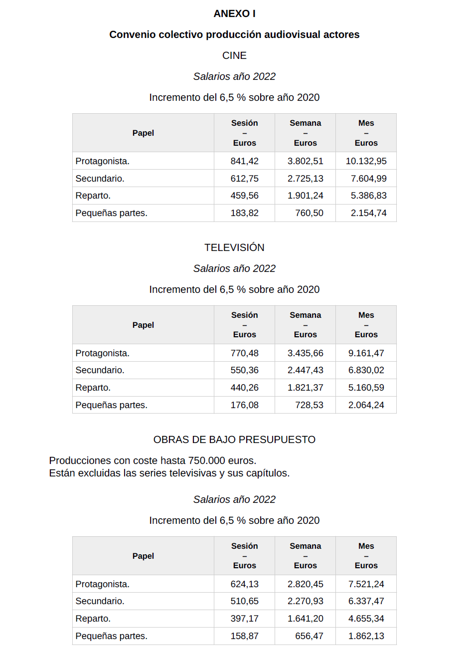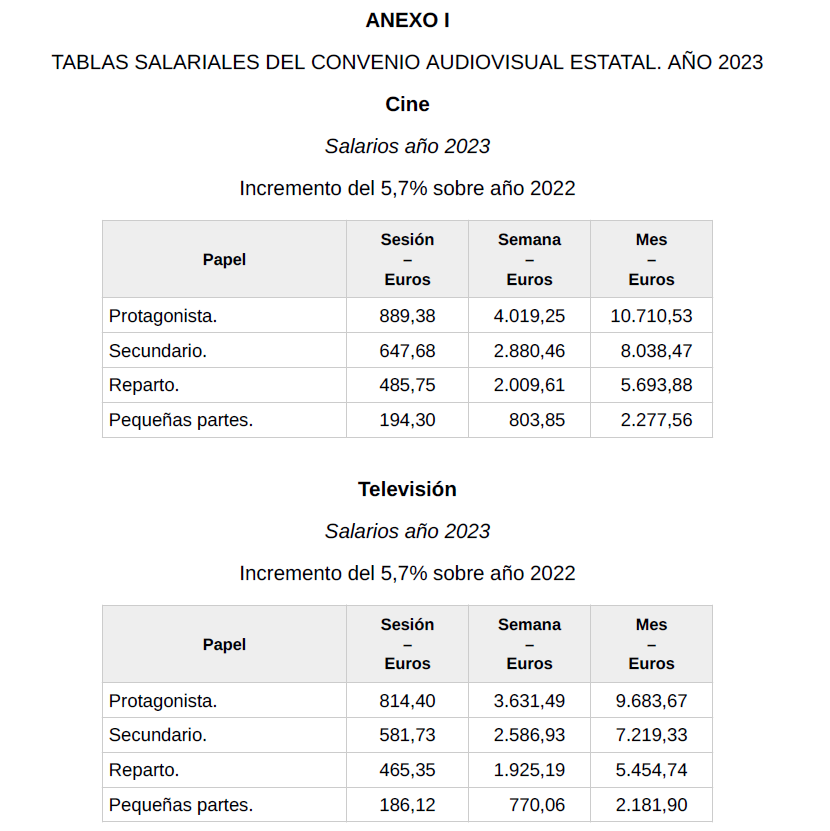 Resolución de 28 de marzo de 2023, de la Dirección General de Trabajo, por la que se registra y publica el incremento y la tabla salarial para el año 2023, y la modificación del Anexo I del III Convenio colectivo estatal regulador de las relaciones laborales entre los productores de obras audiovisuales y los actores que prestan servicios en las mismas.