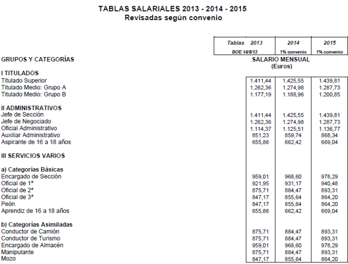 Los sueldos y salarios correspondientes a las distintas categorías de personal, se incrementarán anualmente en un 1% para los años 2013, 2014 y 2015 de vigencia del presente convenio.