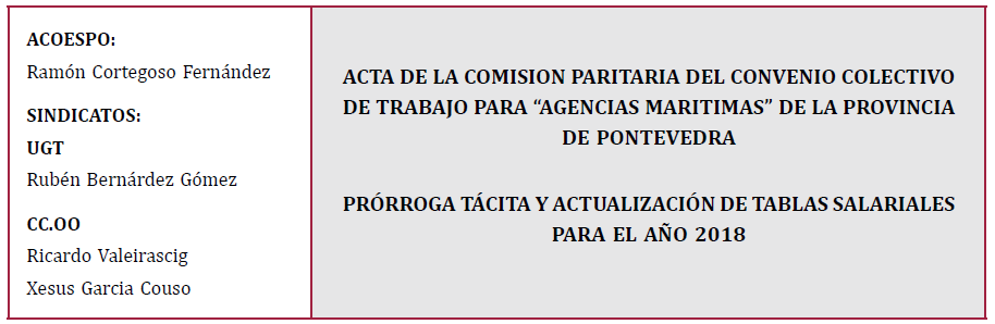 Visto o Acordo da Comisión Paritaria polo que se prorroga o convenio colectivo do Sector de «Agencias Marítimas, Consignatarias, Estibadoras de Buques y Actividades afines»da provincia de Pontevedra, para o ano 2018 e se actualizan as táboas salariais, dito acorto foi subscrito en representación da parte económica, por unha representación da Asociación de Empresas Consignatarias y Estibadoras de Buques (ACOESPO) da provincia de Pontevedra, e da parte social polos representantes das centrais sindicais, CCOO, UGT e CIG, o 11 de febreiro do 2019.