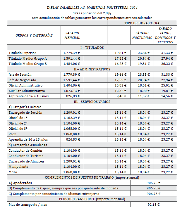 ACTUALIZACIÓN DAS TÁBOAS SALARIAIS DO ANO 2024, PARA O PERSOAL DAS EMPRESAS DO SECTOR DE AXENCIAS MARÍTIMAS, CONSIGNATARIAS, ESTIBADORAS DE BUQUES E ACTIVIDADES AFÍNS DA PROVINCIA DE PONTEVEDRA.