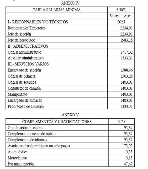 Categorías: Según acuerdo de las partes, recogido en el texto del Convenio Colectivo firmado el 30 de diciembre de 2013 las siguientes categorías: Titulado/a superior, Titulados/as medios, Telefonista, Conserje, Cobrador/a, Ordenanza, Portero/a, Guardián/a, Sereno, Personal de limpieza y Conductor/a de turismo, quedan extinguidas, no obstante mientras algún trabajador/a ostente las mismas, se le aplicará sobre los salarios que vinieran percibiendo la subida porcentual que fije el convenio.