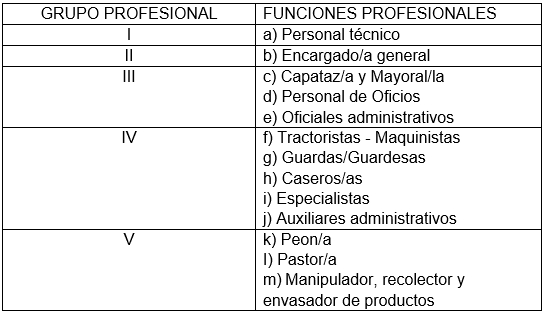 i. Especialistas: Forman este grupo, aquellas personas trabajadoras tituladas o que por una práctica continuada realizan cometidos para los que se requieren conocimientos específicos, vaqueros/as, podadores/as, injertadores/as, sulfatadores/as, etc.