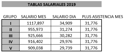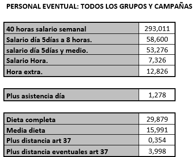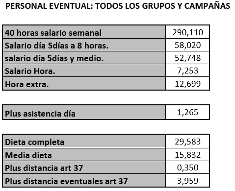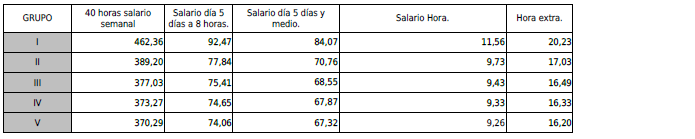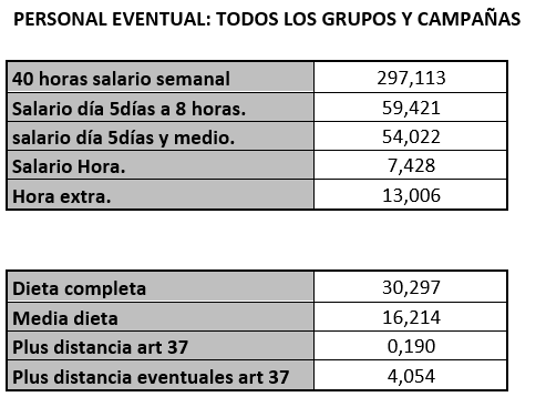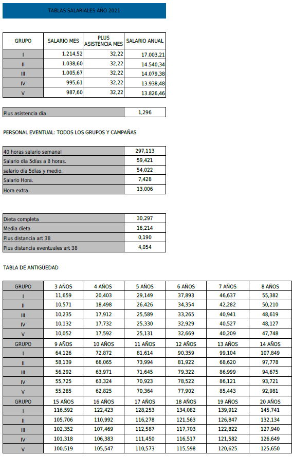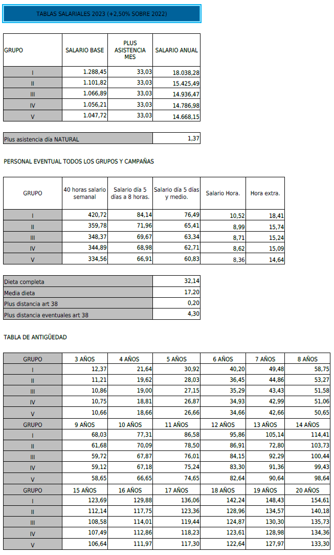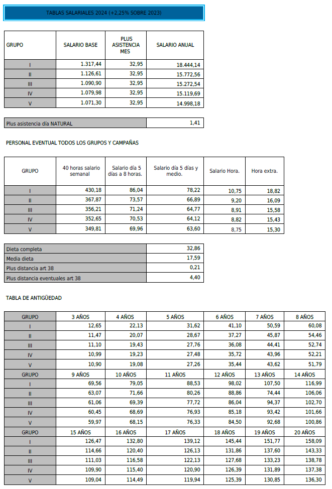 PRIMERO. – Se acuerda fijar y aprobar las tablas SALARIALES DEFINITIVAS del año 2024, para adecuarlas al salario mínimo interprofesional lo que supone la aplicación de un incremento del 8,25% a las tablas salariales del 2023, que se adjuntan a la presente acta.