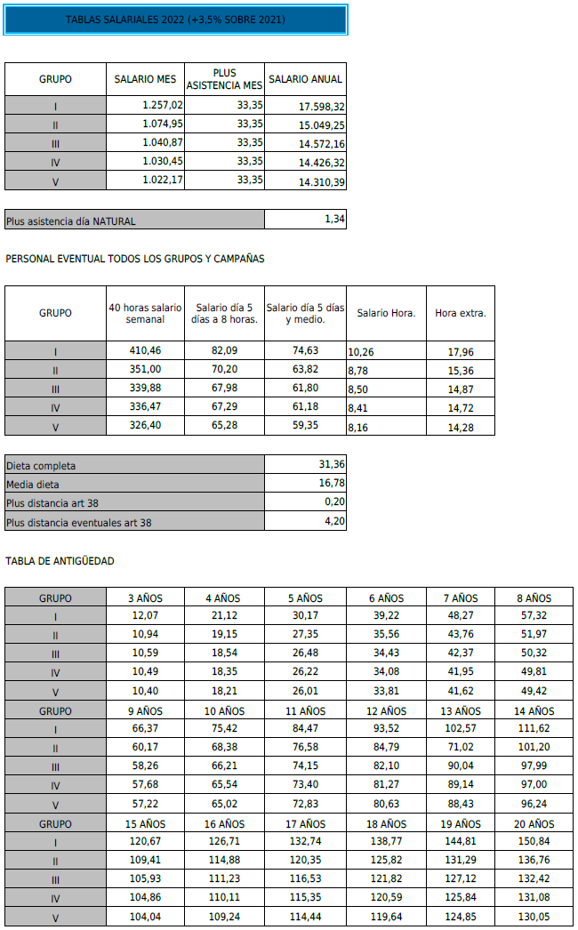 Para el traslado de las personas trabajadoras, al lugar de trabajo, las empresas facilitarán los medios necesarios o compensarán económicamente al trabajador con los siguientes importes recogidos en las tablas salariales anuales.