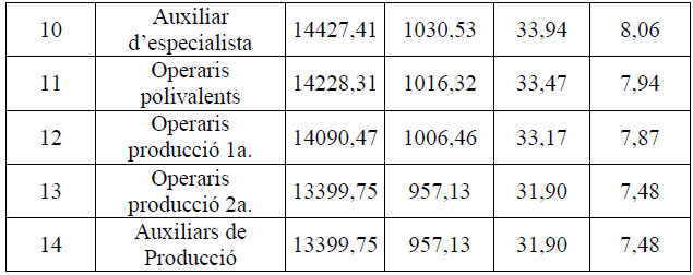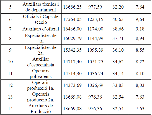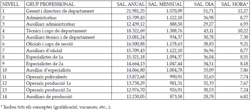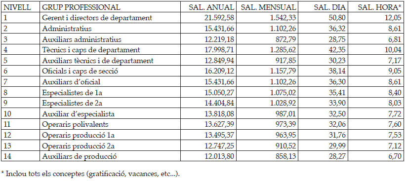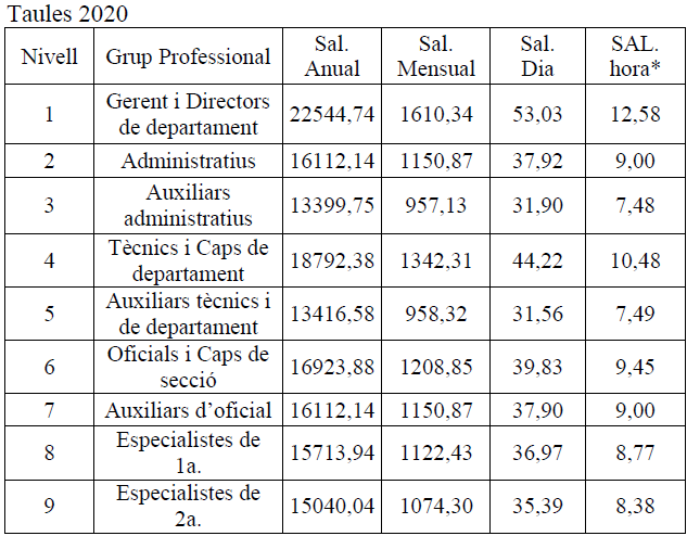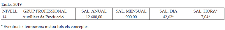 Els treballadors eventuals, percebran el salari hora que s’especifica, també, en les taules salarials i que inclou la part proporcional de vacances, gratificacions extraordinàries, diumenges i festius.