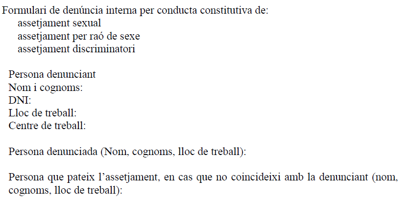 – Identificació de la presumpta persona assetjadora, i lloc que ocupa.