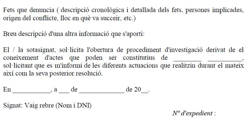 La denúncia es farà sempre per escrit. Les persones responsables de la instrucció de procediment li han d’assignar un número d’expedient.