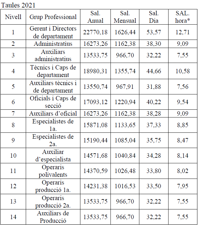 El salari que percebran els treballadors acollits a aquest Conveni serà el que figura en les taules salarials annexes. Els salaris es pagaran del dia 1 al 5 de cada mes.