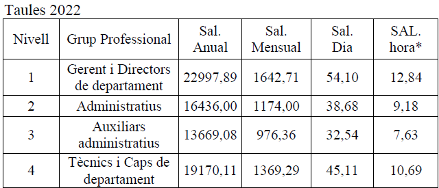 Una vegada s´ha constatat per l´INE, que l´IPC general espanyol de l´any 2021 ha estat superior al 3%, procedeix incrementar les taules salarials del conveni per aquest any 2022 en aquest percentatge d´acord amb el que preveu el seu article 18. També s´ha incorporat a les taules d´aquest any, el nou salari mínim interprofessional que fixa el RD 152/2022 de 22 de febrer; i a aquest efectes signen les taules que seran les vigents per aquest any i que s´adjunten a la present acta com a annex número 1.