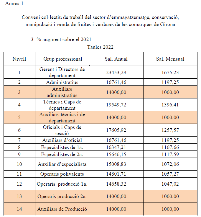 RESOLUCIÓ de 27 d’abril de 2022, per la qual es disposa la inscripció i la publicació de la revisió salarial per a l’any 2022 del Conveni col·lectiu de treball del sector d’emmagatzematge, conservació, manipulació i venda de fruites i verdures de les comarques de Girona (codi de conveni núm. 17002095012005).