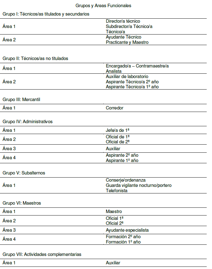 El personal que presta servicio en las empresas se clasifican teniendo en cuenta las funciones que realiza en cada uno de los grupos profesionales y/o puestos de trabajo, así como dentro de sus áreas funcionales respectivamente, según el esquema siguiente: