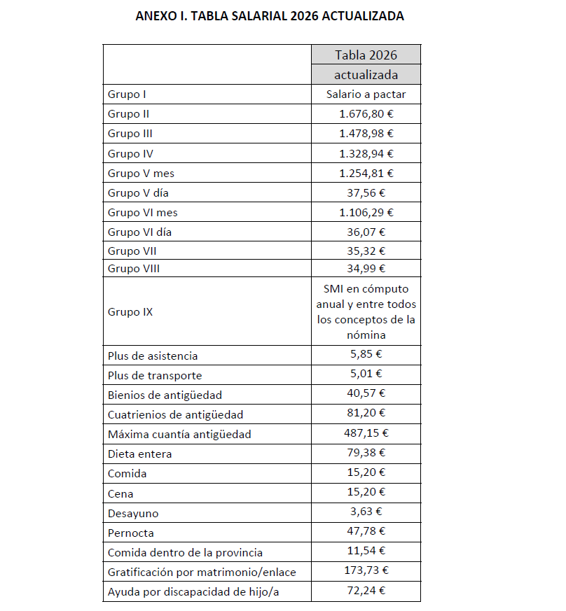 1. Que habiéndose constatado que a fecha 31/12/2025 el IPC real es superior a lo pactado en el artículo 11 del citado convenio colectivo para las retribuciones del año 2025, se procede a dicha actualización, así como a la revisión de las tablas salariales para el año 2026 cuyas cuantías quedan establecidas según tablas adjunta.