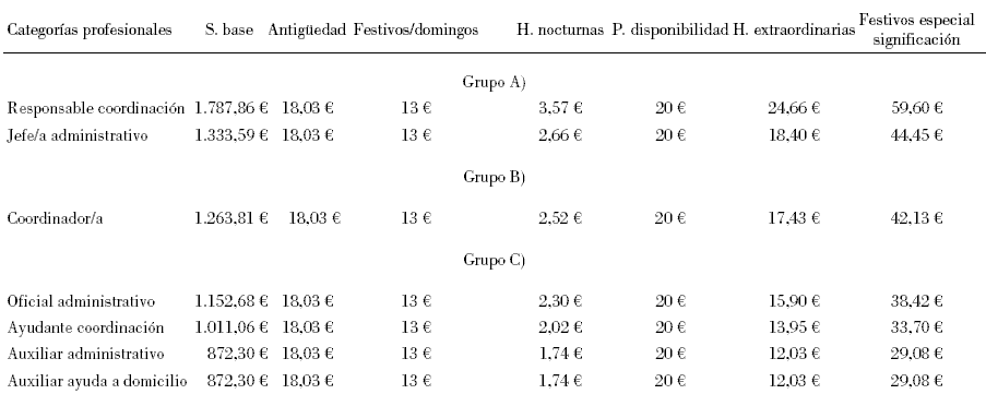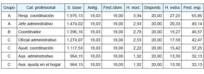 Las categorías profesionales son las que se detallan en la tabla salarial de este convenio, clasificadas en función del grupo profesional en el que están inscritas.