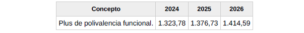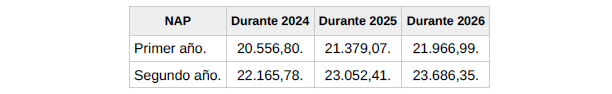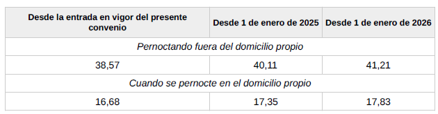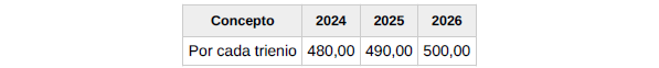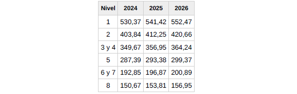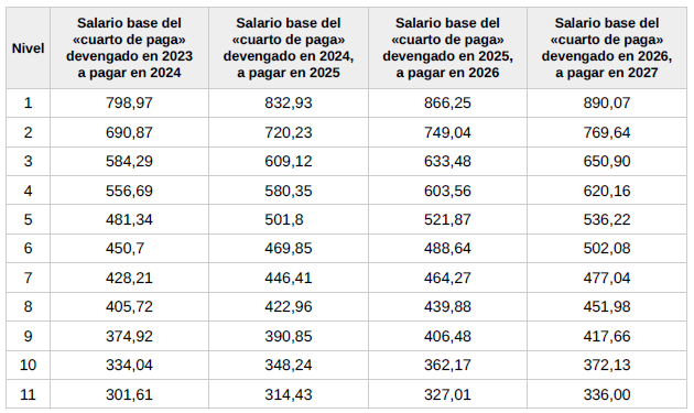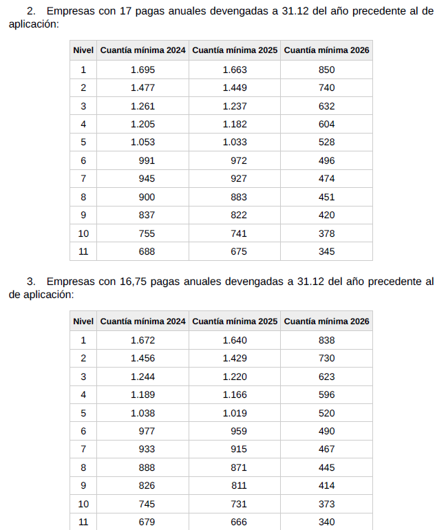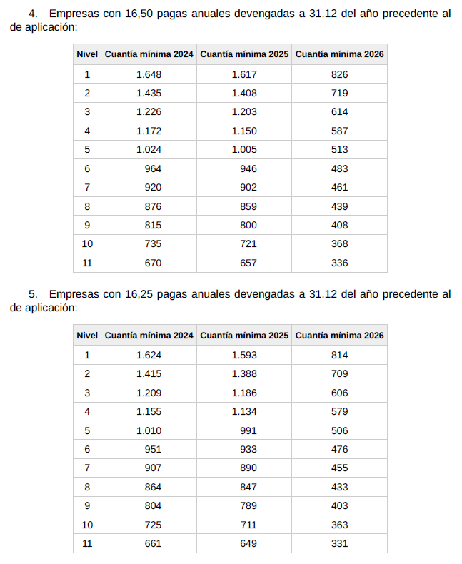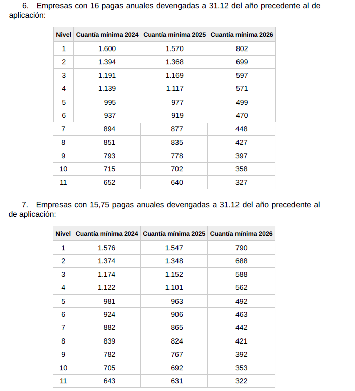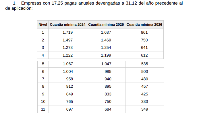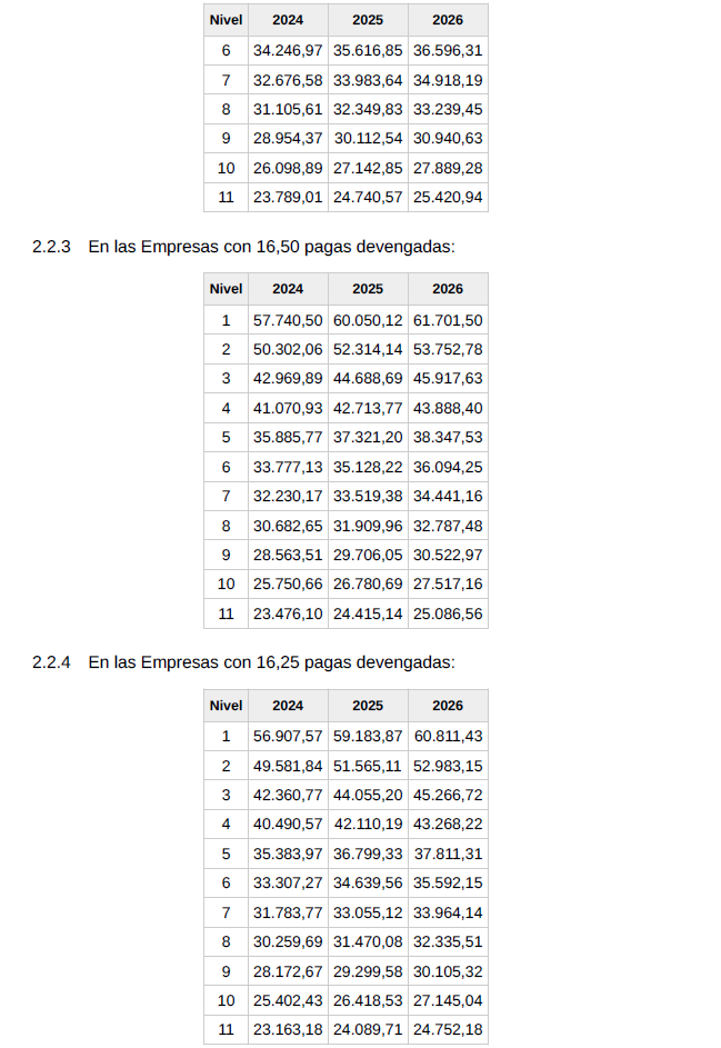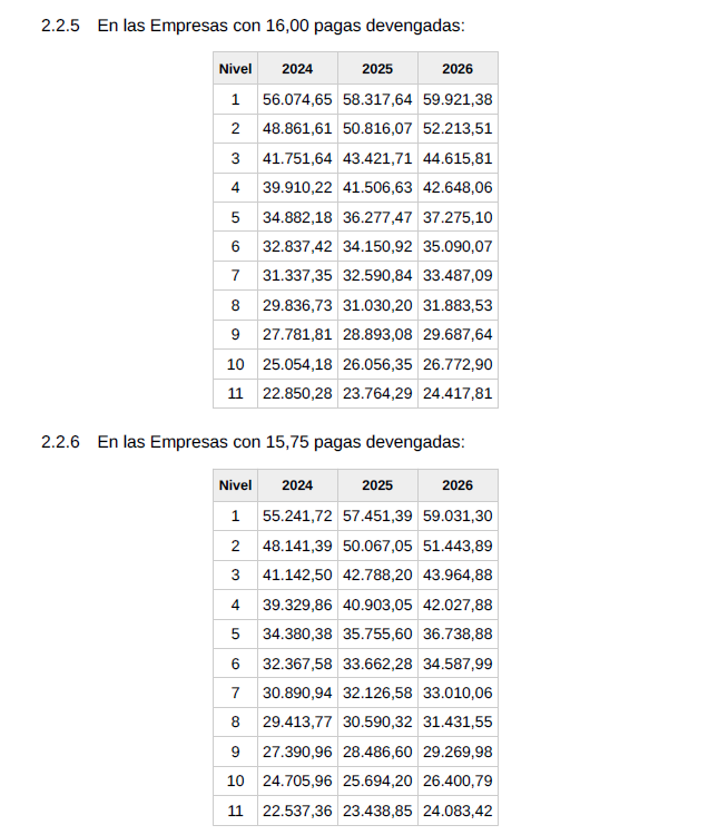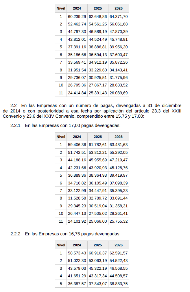 f) Salario. El conjunto de las percepciones de convenio en cómputo anual será el que se detalla en la siguiente tabla y se abonará en catorceavas partes iguales: doce en las mensualidades ordinarias y las dos restantes como gratificaciones extraordinarias semestrales de junio y diciembre respectivamente.