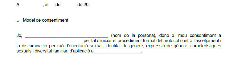 – Proposta de models documentals del protocol o Model de comunicació/denúncia Sol·licitud d’inici del procediment d’actuació segons el protocol contra la discriminació i l’assetjament per raó d’orientació sexual, identitat de gènere, expressió de gènere, característiques sexuals i diversitat familiar.